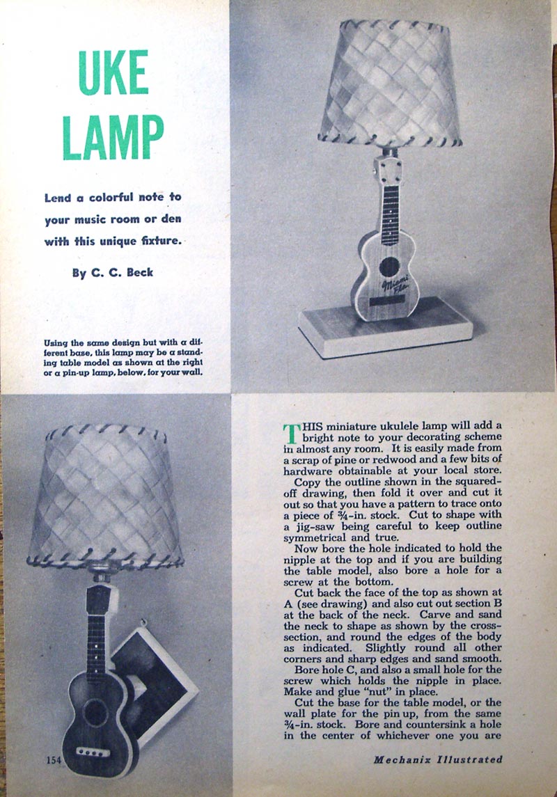 Hey, Dads out there! Get a new jigsaw for Fathers' Day? Here's a swell project for that tiki bar. And the best part? No ukuleles will be harmed in the making of this swell lamp from the July 1954 issue of Mechanix Illustrated.
